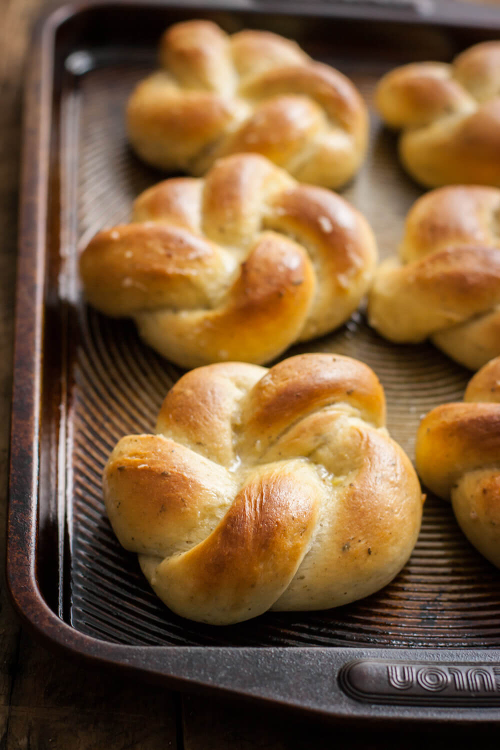 - While baking, mash 2 roasted garlic cloves and mix with melted butter. Brush over hot rolls and sprinkle with sea salt. Serve immediately.